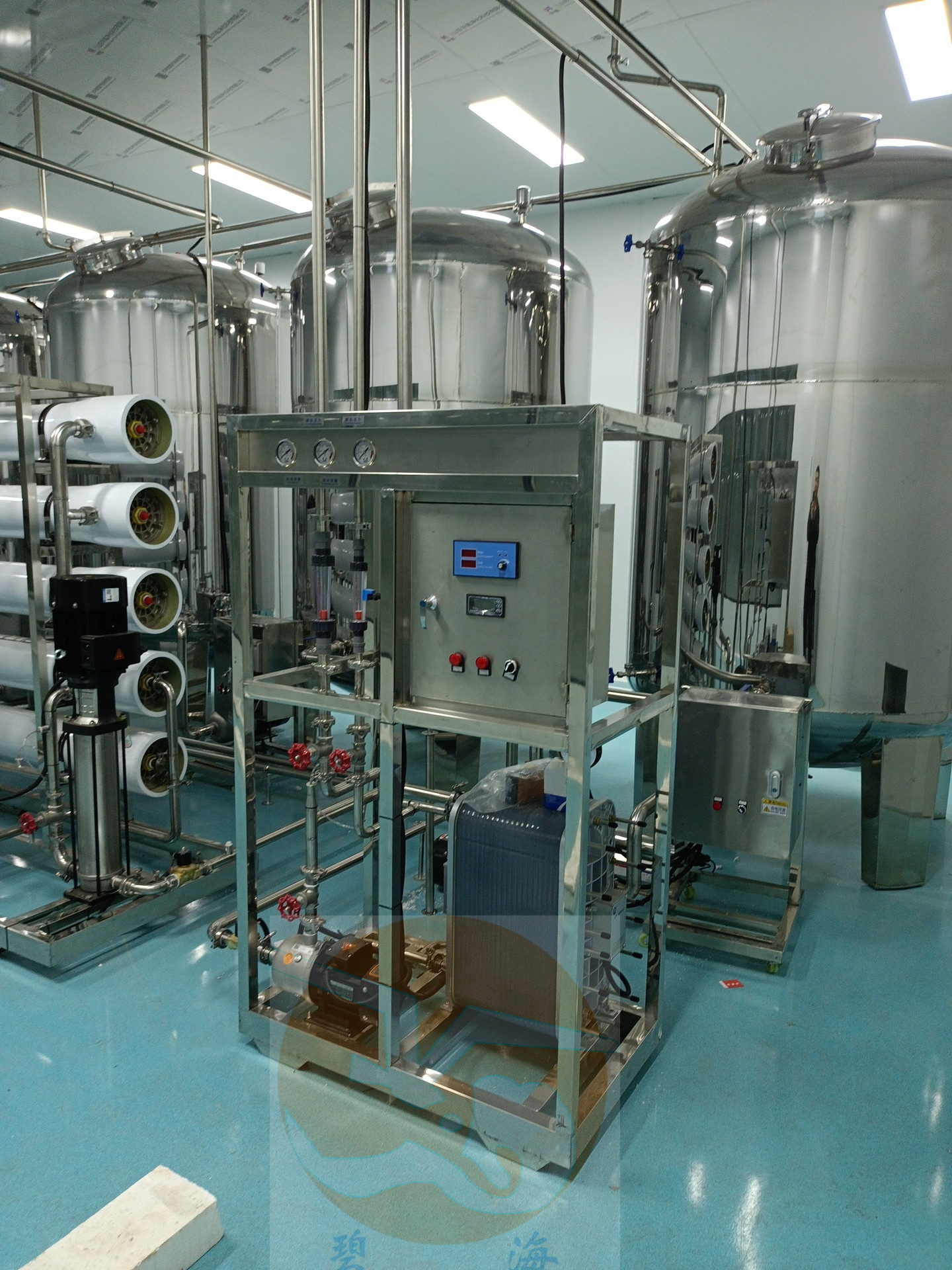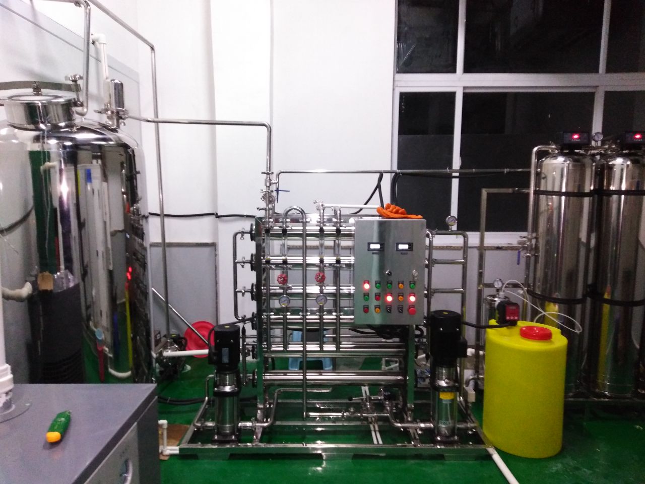 原水-原水加壓泵→多介質(zhì)過濾器→活性炭過濾器→軟水器→精密過濾器→一級反滲透機→中間水箱→ 中間水泵→EDI系統(tǒng)→純化水箱→純水泵→紫外線殺菌器→微孔過濾器→用水點